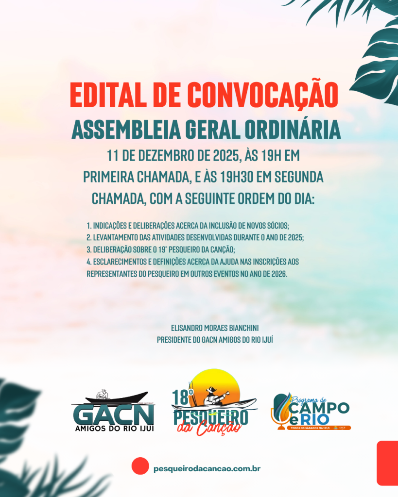 Na noite do dia 12 de dezembro de 2024, o Grupo de Arte e Cultura Nativa Amigos do Rio Ijuí (GACN) realizou sua Assembleia Geral Ordinária, reunindo membros e associados para tratar de temas relevantes à entidade. O evento, realizado com ampla participação, teve como pauta os seguintes assuntos: Um dos destaques da noite foi