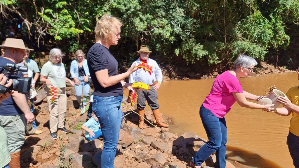 A manhã de sábado foi profundamente marcada por uma comovente homenagem ao presidente Gilmar Lang, que nos deixou no ano anterior. Em meio à presença emocionada de familiares e amigos, deu-se início a uma caminhada significativa, partindo da entrada do parque e seguindo até às margens do rio. Foi um momento tocante, no qual o filho Afonso teve a honra de lançar as cinzas de Gilmar nas águas do rio Ijuí